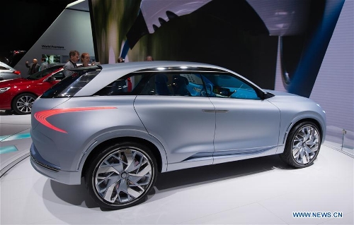 A Hyundai FE Fuel Cell car is seen on the second press day of the 87th International Motor Show in Geneva, Switzerland, on March 8, 2017. (Xinhua/Xu Jinquan)