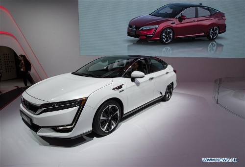 A Honda Clarity car is seen on the second press day of the 87th International Motor Show in Geneva, Switzerland, on March 8, 2017. (Xinhua/Xu Jinquan)