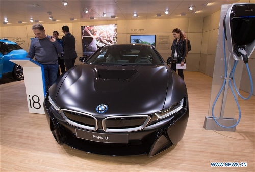 A BMW i8 is seen on the second press day of the 87th International Motor Show in Geneva, Switzerland, on March 8, 2017. (Xinhua/Xu Jinquan)