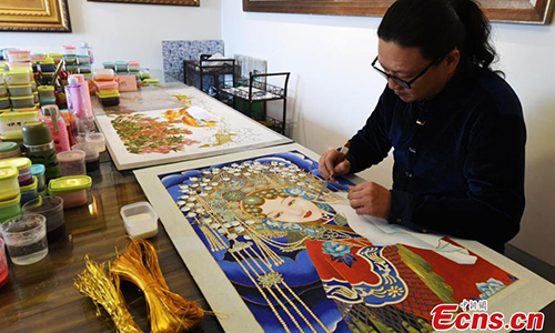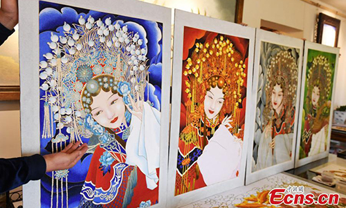 Folk artist Li Haiming makes an enamel drawing of the Four Great Beauties, four ancient Chinese women renowned for their beauty, in Peking Opera costumes in his studio in Lanzhou City, the capital of Northwest China’s Gansu Province, March 7, 2017. It took Li almost half a year to make the work with a 20-meter-long wire that looks like gold thread. For nearly 20 years, Li has experimented with combining enamel skills with drawing, a process that usually involves time-consuming procedures. (Photo: China News Service/Yang Yanmin)