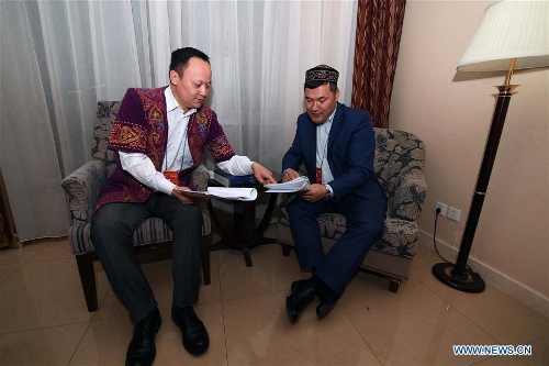 Language service staff members Baowuerjiang (L) and Bieerkenuer discuss the translation of a document in Beijing, capital of China, March 7, 2017. During the ongoing sessions of China's National People's Congress (NPC) and the Chinese People's Political Consultative Conference (CPPCC), translators and interpreters from China Ethnic Languages Translation Bureau provided services in languages of Mongolian, Tibetan, Uygur, Kazak, Korean, Yi and Zhuang ethnic groups to attendees. (Xinhua/Chen Yehua)