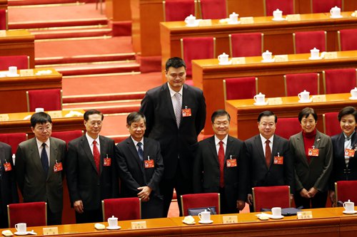 Yao Ming, the newly elected president of the Chinese Basketball Association, poses for photograph with a group of members of the National Committee of the Chinese People's Political Consultative Conference during the ongoing two sessions on Friday (See stories on pages 2 and 3). Photo: CFP
