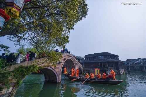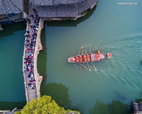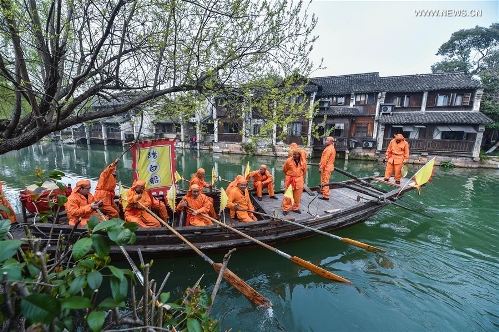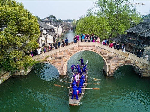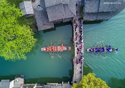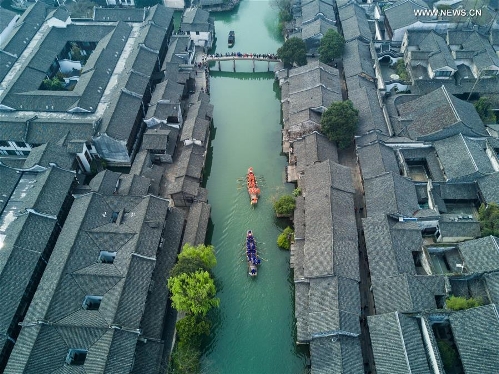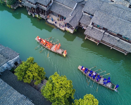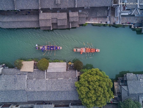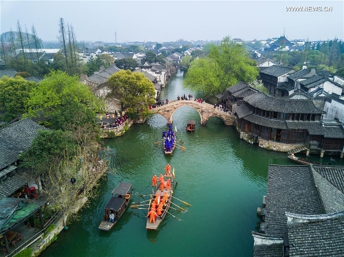 Aerial photo taken on March 29, 2017 shows a boat competition to celebrate the upcoming Sanyuesan Festival at Xizha scenic spot in Hangzhou, capital of east China's Zhejiang Province. The Sanyuesan Festival is celebrated on the third day of the third lunar month. (Xinhua/Xu Yu)