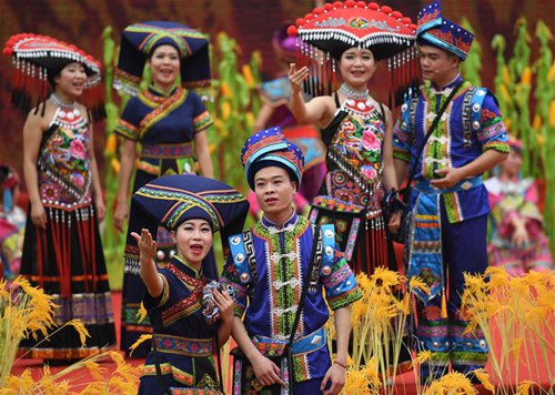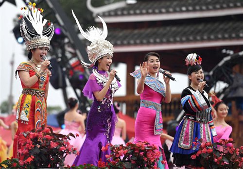 Singers perform at a celebration of "Sanyuesan" festival in Nanning, capital of south China's Guangxi Zhuang Autonomous Region, March 30, 2017. People of Zhuang ethnic group in Guangxi have a tradition to celebrate the Sanyuesan Festival on the third day of the third lunar month by wearing their traditional costumes. (Xinhua/Zhou Hua)