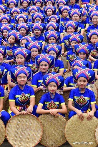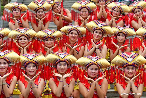 Girls pose before dancing at the opening ceremony of the Luoyue cultural and tourism festival for the "Sanyuesan" celebration in Nanning, capital of south China's Guangxi Zhuang Autonomous Region, March 30, 2017. People of Zhuang ethnic group in Guangxi have a tradition to celebrate the Sanyuesan Festival on the third day of the third lunar month by wearing their traditional costumes. (Xinhua/Huang Xiaobang)