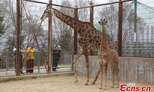 A 6-month-old baby giraffe and its mother at an enclosure in the Qinghai-Tibet Plateau Wild Animal Zoo in Xining City, the capital of Northwest China’s Qinghai Province, April 6, 2017. The zoo, 2,300 meters above sea level, said it has bred a giraffe at the world’s highest altitude. More than 3,000 animals from 127 species now live in the zoo. (Photo: China News Service/Luo Yunpeng)