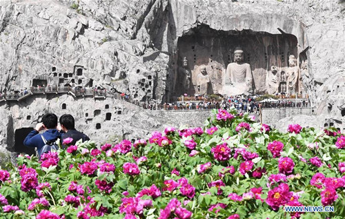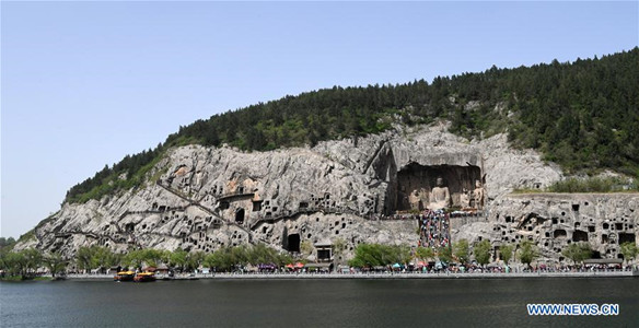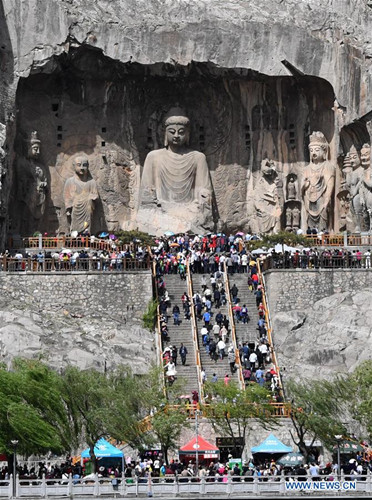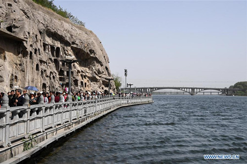 Tourists visit the Longmen Grottoes in Luoyang, central China's Henan Province, April 17, 2017. The Longmen Grottoes has entered into tourist rush season. (Xinhua/Zhu Xiang)