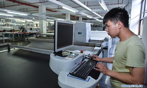 A staff member operates an automated machine to cut the fabric at a kid garment enterprise in Zhili Town, Huzhou City, east China's Zhejiang Province, May 9, 2017. Now there are more than 50 enterprises that have introduced full sets of automated garment manufacturing equipment in Zhili, a town famous for making kid garments in China. (Xinhua/Xu Yu)