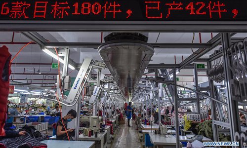 Photo taken on May 9, 2017 shows an automated system for shifting garments at a kid garment enterprise in Zhili Town, Huzhou City, east China's Zhejiang Province. Now there are more than 50 enterprises that have introduced full sets of automated garment manufacturing equipment in Zhili, a town famous for making kid garments in China. (Xinhua/Xu Yu)