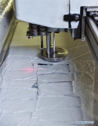 Photo taken on May 9, 2017 shows an automated machine cutting the fabric at a kid garment enterprise in Zhili Town, Huzhou City, east China's Zhejiang Province. Now there are more than 50 enterprises that have introduced full sets of automated garment manufacturing equipment in Zhili, a town famous for making kid garments in China. (Xinhua/Xu Yu)