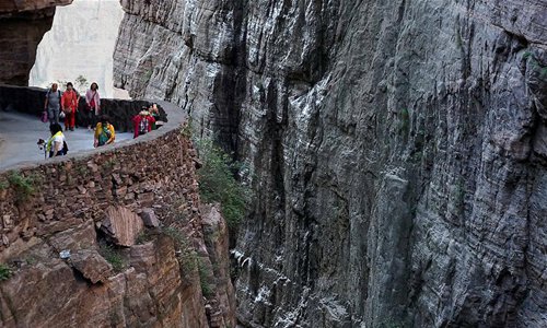 Tourists view the scenery at a site on the Guoliang cliff corridor in Guoliang Village, Huixian County, central China's Henan Province, May 13, 2017. The Guoliang cliff corridor is a 1,300-meter-long road built along the cliff of 1,000 meters high. The construction of this miraculous road lasted five years from 1972 to 1977, and was built purely by hand by villagers of Guoliang Village. (Xinhua/Li An)