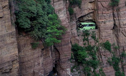 A tour bus runs on the Guoliang cliff corridor in Guoliang Village, Huixian County, central China's Henan Province, May 13, 2017. The Guoliang cliff corridor is a 1,300-meter-long road built along the cliff of 1,000 meters high. The construction of this miraculous road lasted five years from 1972 to 1977, and was built purely by hand by villagers of Guoliang Village. (Xinhua/Li An)