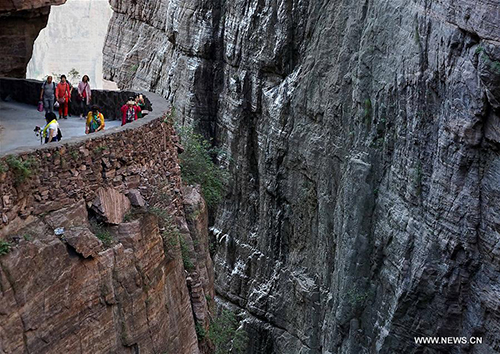 Tourists walk on the Guoliang cliff corridor in Guoliang Village, Huixian County, central China's Henan Province, May 13, 2017. The Guoliang cliff corridor is a 1,300-meter-long road built along the cliff of 1,000 meters high. The construction of this miraculous road lasted five years from 1972 to 1977, and was built purely by hand by villagers of Guoliang Village. (Xinhua/Li An)