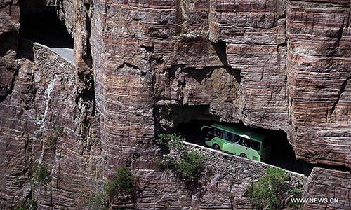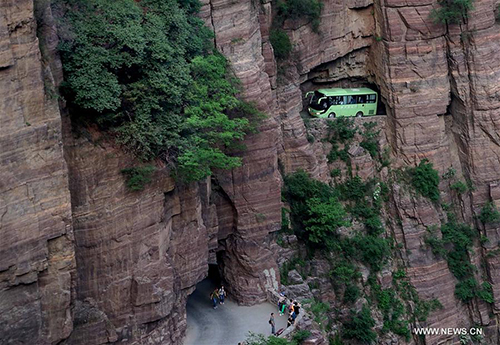 A tour bus runs on the Guoliang cliff corridor in Guoliang Village, Huixian County, central China's Henan Province, May 13, 2017. The Guoliang cliff corridor is a 1,300-meter-long road built along the cliff of 1,000 meters high. The construction of this miraculous road lasted five years from 1972 to 1977, and was built purely by hand by villagers of Guoliang Village. (Xinhua/Li An)