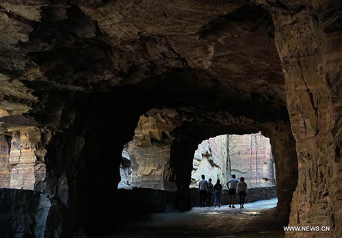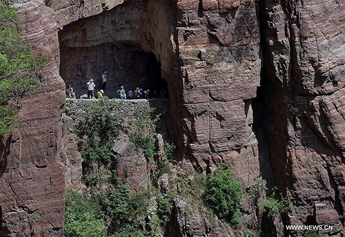 Tourists view scenery at a site on the Guoliang cliff corridor in Guoliang Village, Huixian County, central China's Henan Province, May 13, 2017. The Guoliang cliff corridor is a 1,300-meter-long road built along the cliff of 1,000 meters high. The construction of this miraculous road lasted five years from 1972 to 1977, and was built purely by hand by villagers of Guoliang Village. (Xinhua/Li An)