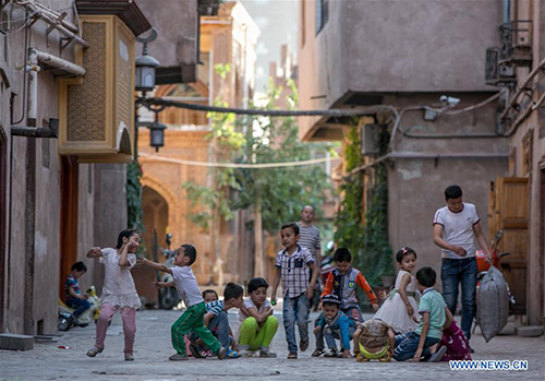 Children play a game in the old town of Kashgar, northwest China's Xinjiang Uygur Autonomous Region, May 20, 2017. (Xinhua/Li Jing)
