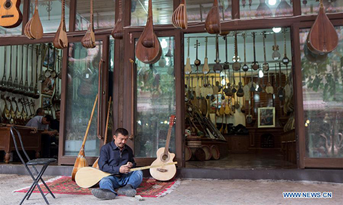 A handicraftsman tunes an instrument at a shop in the old town of Kashgar, northwest China's Xinjiang Uygur Autonomous Region, May 31, 2017. (Xinhua/Li Jing)