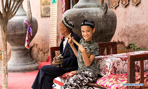 A boy plays a traditional instrument in the old town of Kashgar, northwest China's Xinjiang Uygur Autonomous Region, May 15, 2017. (Xinhua/Li Jing)
