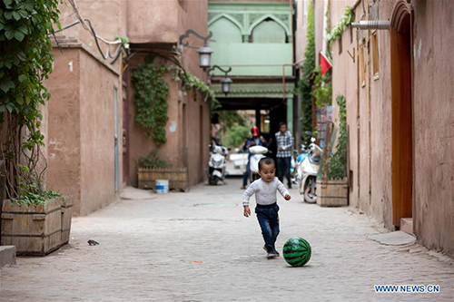 A child kicks a ball in the old town of Kashgar, northwest China's Xinjiang Uygur Autonomous Region, May 31, 2017. (Xinhua/Li Jing)