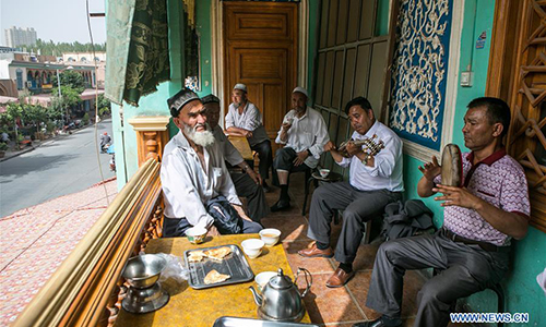 Residents are seen at a teahouse in the old town of Kashgar, northwest China's Xinjiang Uygur Autonomous Region, May 22, 2017. (Xinhua/Li Jing)
