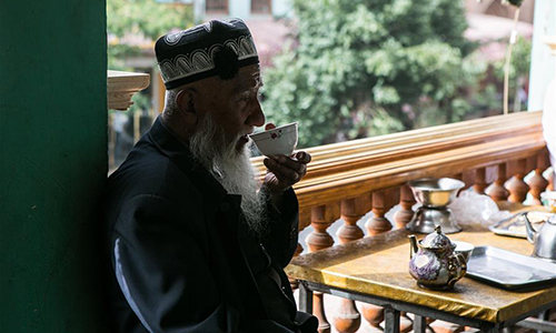 A resident drinks tea at a teahouse in the old town of Kashgar, northwest China's Xinjiang Uygur Autonomous Region, May 22, 2017. (Xinhua/Li Jing)
