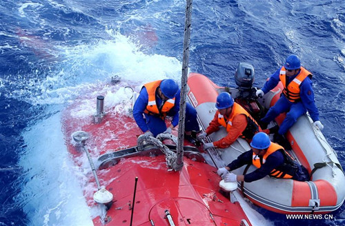 China's manned submersible Jiaolong leaves the water after its dive in the Yap Trench in the west Pacific, June 13, 2017. China's manned submersible Jiaolong dived to 6,681 meters in the Yap Trench in the west Pacific Tuesday. The dive is the final one in China's 38th oceanic scientific expedition, marking the end of a four-year tentative application phase of the submersible. (Xinhua/Liu Shiping)