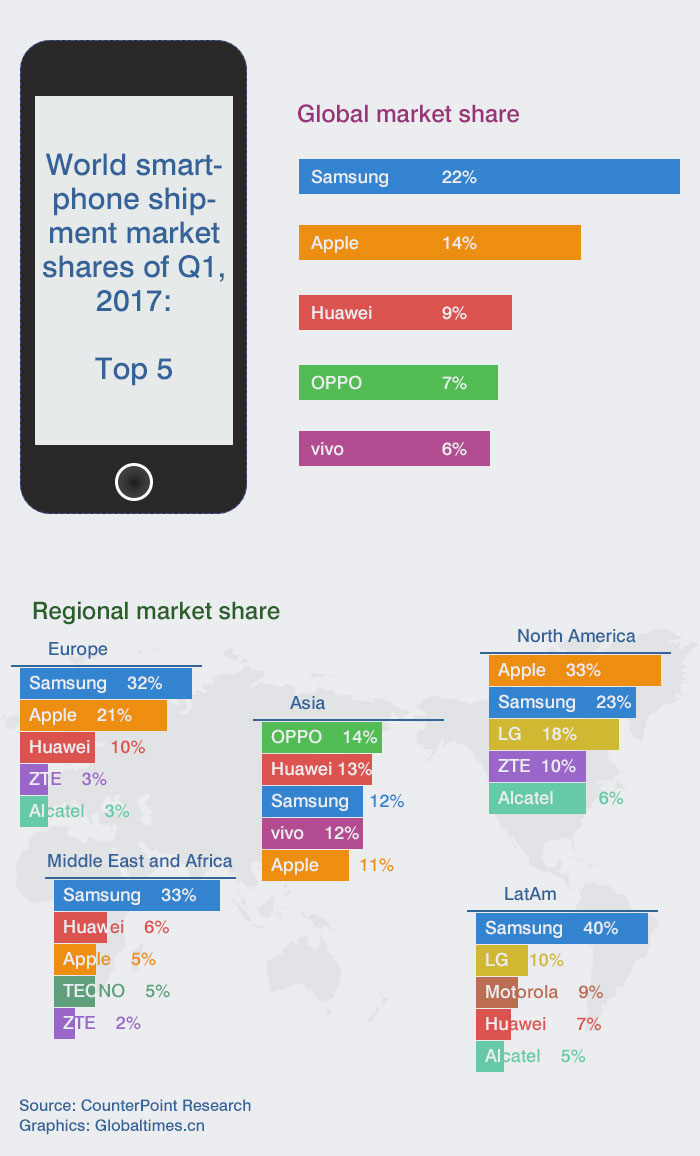 3 of top 5 global smartphone brands by shipment market share Chinese-owned