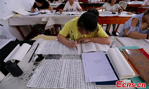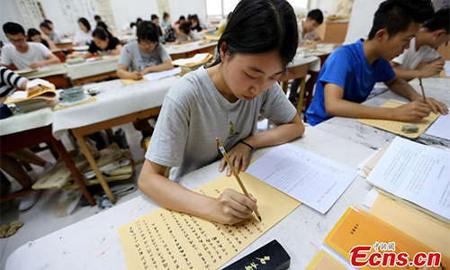 Students take a test at Yu Youren School of Calligraphy at Xianyang Normal University in Xianyang City, Northwest China’s Shaanxi Province, June 23, 2017. The school requires its students to complete their semester test using writing brushes, which takes about five hours to hand-write 2,000 Chinese characters. (Photo: China News Service/Zhang Yuan)