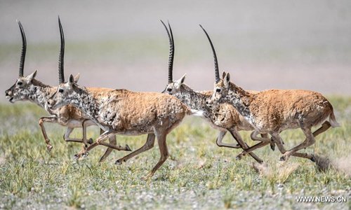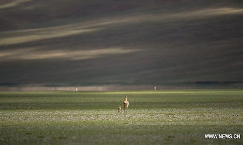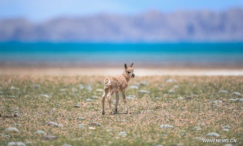 A Tibetan antelope is seen at Changtang National Nature Reserve in southwest China's Tibet Autonomous Region, June 24, 2017. It is breeding season of Tibetan antelopes at Changtang. There are over 3,000 ewes awaiting delivery or just delivered simply at the reserve in Qiuka region of Xainza County. The total number of Tibetan antelopes has risen to more than 200,000 at Changtang. With an area of 298,000 square km and an average altitude of 5,000 meters, Changtang is China's biggest and highest reserve. The area is located in northern Tibet where few humans reside, however, it is a wildlife paradise, and home to a variety of wildlife species and numerous lakes. More than 40 species of rare wild animals including Tibetan antelopes, Tibetan wild donkeys, Tibetan yaks and black-necked cranes living in the region. (Xinhua/Purbu Zhaxi)
