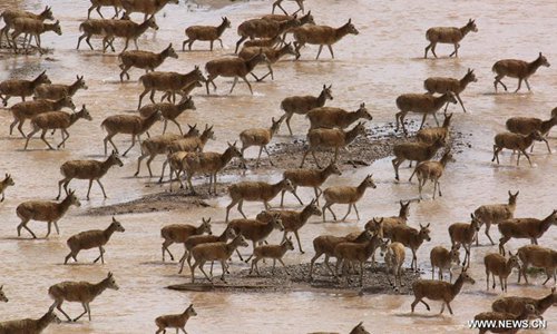A herd of Tibetan antelope ewes migrate to breeding area at Changtang National Nature Reserve in southwest China's Tibet Autonomous Region, June 24, 2017. It is breeding season of Tibetan antelopes at Changtang. There are over 3,000 ewes awaiting delivery or just delivered simply at the reserve in Qiuka region of Xainza County. The total number of Tibetan antelopes has risen to more than 200,000 at Changtang. With an area of 298,000 square km and an average altitude of 5,000 meters, Changtang is China's biggest and highest reserve. The area is located in northern Tibet where few humans reside, however, it is a wildlife paradise, and home to a variety of wildlife species and numerous lakes. More than 40 species of rare wild animals including Tibetan antelopes, Tibetan wild donkeys, Tibetan yaks and black-necked cranes living in the region.(Xinhua/Purbu Zhaxi)