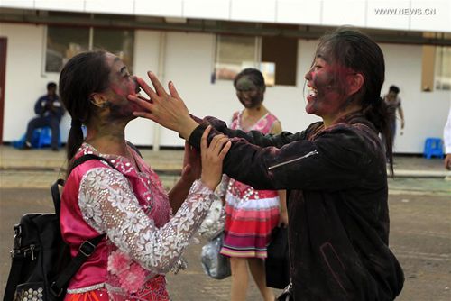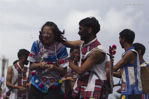 Tourists daub rice ash onto each other during the Hualian Festival in Qiubei County of southwest China's Yunnan Province, July 18, 2017. The Hualian Festival is a traditional annual festival of the Yi ethnic group in Qiubei County where people express best wishes by daubing black rice ash on face to get good luck. (Xinhua/Jing Huihui)