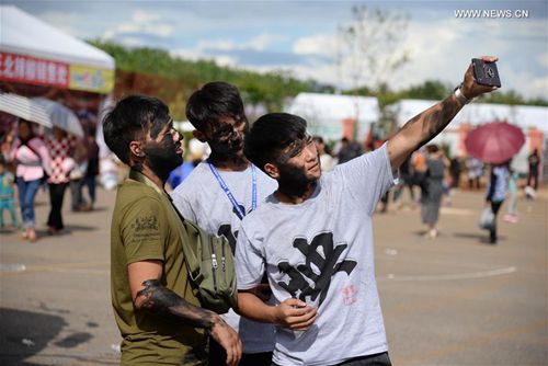 Tourists take selfies as they daub rice ash onto each other during the Hualian Festival in Qiubei County of southwest China's Yunnan Province, July 18, 2017. The Hualian Festival is a traditional annual festival of the Yi ethnic group in Qiubei County where people express best wishes by daubing black rice ash on face to get good luck. (Xinhua/Pu Chao)