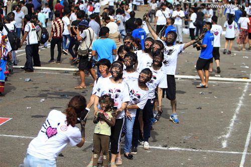 Tourists daub rice ash onto each other during the Hualian Festival in Qiubei County of southwest China's Yunnan Province, July 18, 2017. The Hualian Festival is a traditional annual festival of the Yi ethnic group in Qiubei County where people express best wishes by daubing black rice ash on face to get good luck. (Xinhua/Pu Chao)