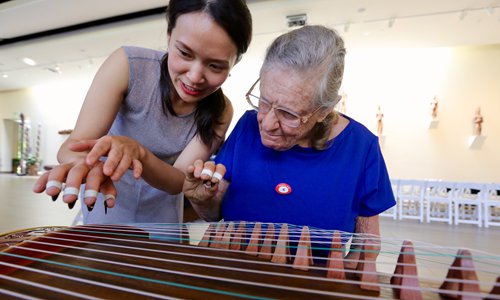 A senior learns techniques of performing Guzheng, a traditional Chinese music instrument, from a tutor during an introductory class in the Bowers Museum in the city of Irvine, Orange County earlier this month. Photo: Yu Yan