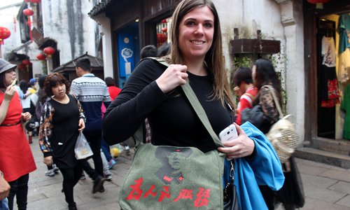 A foreigner shows off a bag with Lei Feng. Photo: IC