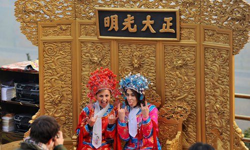 Two foreign women take a photo in ancient Chinese costume at the Palace Museum. Photo: IC