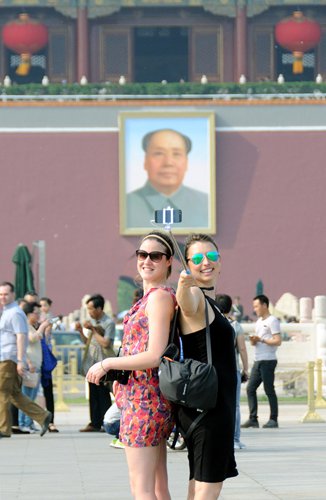 Two foreigners take a selfie in Tiananmen Square. Photo: IC
