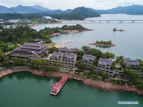 Workers collect the waste water from an island hotel in Qiandaohu Lake in Chun'an County of east China's Zhejiang Province Aug. 16, 2017. The lake, a famous scenic spot, is under stricter protection now as the local government issued a zero emission policy according to which garbage disposal, residents' waste water and vehicle emission are under tighter control. (Xinhua/Xu Yu)