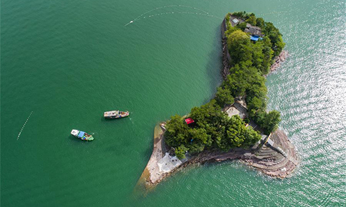 Workers clean the surface of the Qiandaohu Lake in Chun'an County of east China's Zhejiang Province Aug. 16, 2017. The lake, a famous scenic spot, is under stricter protection now as the local government issued a zero emission policy according to which garbage disposal, residents' waste water and vehicle emission are under tighter control. (Xinhua/Xu Yu)