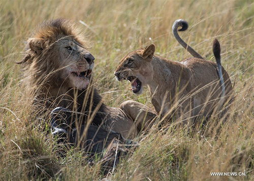 A lioness roars at a lion at the Maasai Mara National Reserve, Kenya, Aug. 29, 2017. (Xinhua/Chen Cheng)