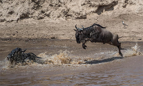 Wildebeests cross the Mara River at the Maasai Mara National Reserve, Kenya, Aug. 28, 2017. (Xinhua/Chen Cheng)