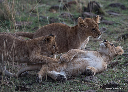 Lion cubs play at the Maasai Mara National Reserve, Kenya, Aug. 28, 2017. (Xinhua/Chen Cheng)