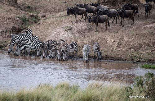 Zebras and wildebeests prepare to cross the Mara River at the Maasai Mara National Reserve, Kenya, Aug. 28, 2017. (Xinhua/Chen Cheng)