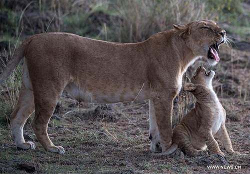 A lioness plays with her cub at the Maasai Mara National Reserve, Kenya, Aug. 28, 2017. (Xinhua/Chen Cheng)