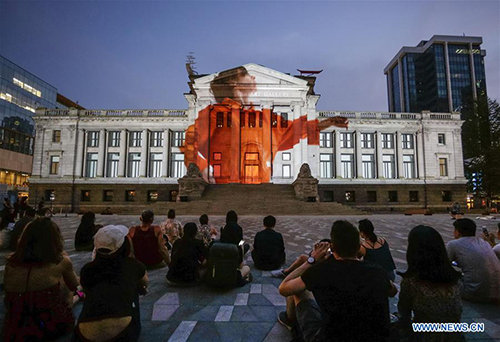 People admire the light projection performance on the wall of Vancouver Art Gallery during the Facade Festival held in Vancouver, Canada. Sept. 4, 2017. (Xinhua/Liang sen)