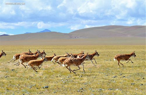 Tibetan antelopes gallop on a pasture in Nyima County, southwest China's Tibet Autonomous Region, Sept. 19, 2017. Changtang National Nature Reserve is a wildlife paradise and home to a variety of wildlife species such as Tibetan antelopes, wild yaks, Tibetan wild donkeys and black-necked cranes. (Xinhua/Zhang Rufeng)