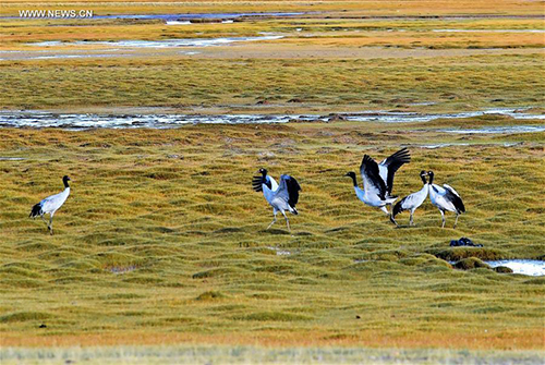Black-necked cranes are seen on a wetland in Nyima County, southwest China's Tibet Autonomous Region, Sept. 19, 2017. Changtang National Nature Reserve is a wildlife paradise and home to a variety of wildlife species such as Tibetan antelopes, wild yaks, Tibetan wild donkeys and black-necked cranes. (Xinhua/Zhang Rufeng)