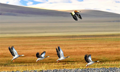 A ruddy shelduck and a flock of barhead geese fly over a wetland in Nyima County, southwest China's Tibet Autonomous Region, Sept. 19, 2017. Changtang National Nature Reserve is a wildlife paradise and home to a variety of wildlife species such as Tibetan antelopes, wild yaks, Tibetan wild donkeys and black-necked cranes. (Xinhua/Zhang Rufeng)