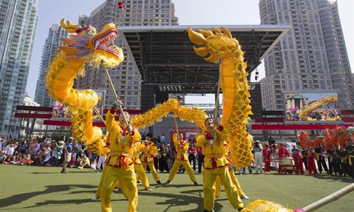 A dragon dance team performs during the 2017 Dragon Lion Dance Festival in Mississauga, Ontario, Canada, Sept. 24, 2017. Photo: Xinhua