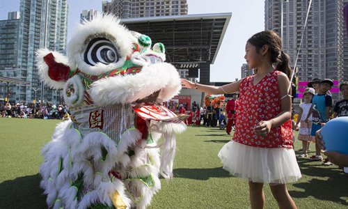 A girl touches a dance lion during the 2017 Dragon Lion Dance Festival in Mississauga, Ontario, Canada, Sept. 24, 2017. Photo: Xinhua